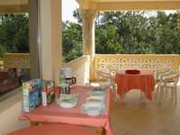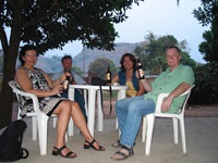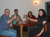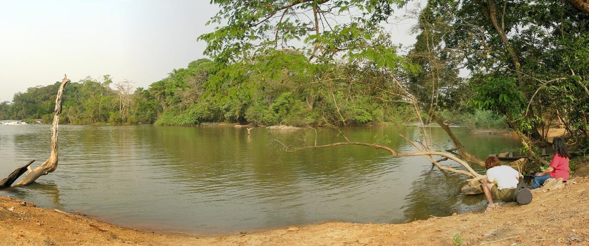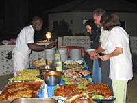 Nach zwei Stunden Fahrt erreicht man N'Zérékoré. Hier gibt es auch wieder eine Telefonverbindung und mehrere Hotels. Für unsere Sylvesterfeier hatte Peter das beste Hotel im Ort ausgesucht. Wir waren gespannt, was uns erwartete. Das Hotel war sehr weitläufig, andere Gäste sahen wir aber keine. Das Sylvesterbuffet sollte am Pool serviert werden. Wir hatten uns tagsüber schon einen schönen Tisch ausgesucht und baten um Reservierung. Gegen 19:00 Uhr begannen die Aktivitäten mit dem Buffetaufbau. Andere Gäste sahen wir immer noch nicht. Etwa um 20:00 bat man uns zu Tisch. Es war außer uns immer noch niemand da, und so sollte es auch bleiben. Das ganze Buffet für uns allein!!! Leider mangelte es wohl an Warmhalteplatten und so waren die warmen Speisen während des Aufbaus schon wieder abgekühlt, zumahl die gefühlte Außentemperatur inzwischen etwa 10 Grad betrug. Aber es war ein Erlebnis der besonderen Art. Pünktlich um Mitternacht gab es dann auch Champagner.Eine Woche später kamen wir noch einmal nach Nzérékoré, übernachteten dann aber in einem einfachen Hotel.