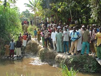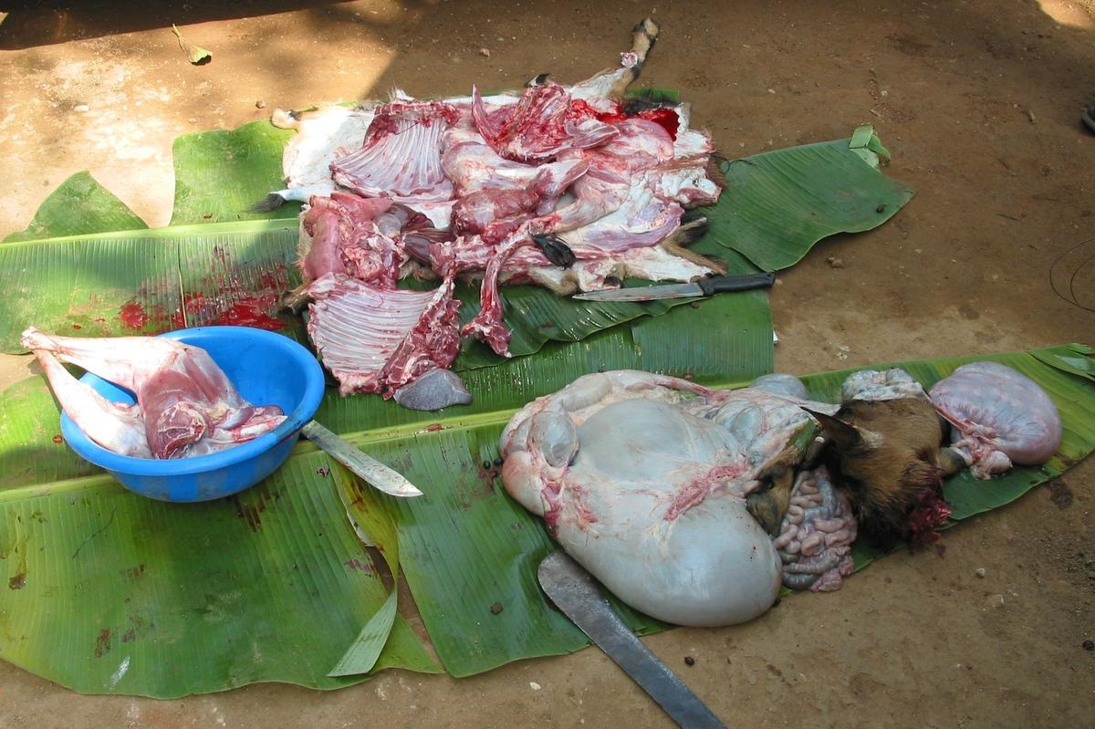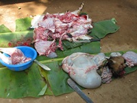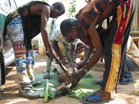 Von hier aus betreute Peter seine Brunnenprojekte in kleinen Dörfern, wohin wir ihn das eine oder andere Mal begleiteten. Oft fuhren wir stundenlang über staubige und ausgewaschene Pisten bis wir die Orte erreichten. Wir konnten den Verhandlungen mit den Dorfältesten zum Abschluss eines neuen Brunnenprojektes beiwohnen und wurden anschließend durch das Dorf geführt und hatten auch die Erlaubnis zu fotografieren. Zum Abschluss einer Verhandlung wurde Peter dann auch eine Ziege übergeben, die dann zu Hause ihr Leben lassen musste.