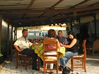 Nach der Ankunft am Flughafen wollte man an der Zollkontrolle unser Gepäck durchsuchen. Wir warteten auf Peter, der uns dann durch energisches Auftreten und die Entrichtung einen kleinen Obolus befreite. Die Landessprache in Guinea ist französisch und somit wären wir hier relativ hilflos den Zöllnern ausgeliefert gewesen. Aber es ging nochmal alles gut und wir fuhren zuerst in das Büro der Organisation, für die Peter arbeitete. Hier erwartete uns ein kaltes Bier. Ich traute meinen Augen kaum: Ein griechisches MYTHOS! Da passte ja der mitgebrachte Ouzo gut dazu.