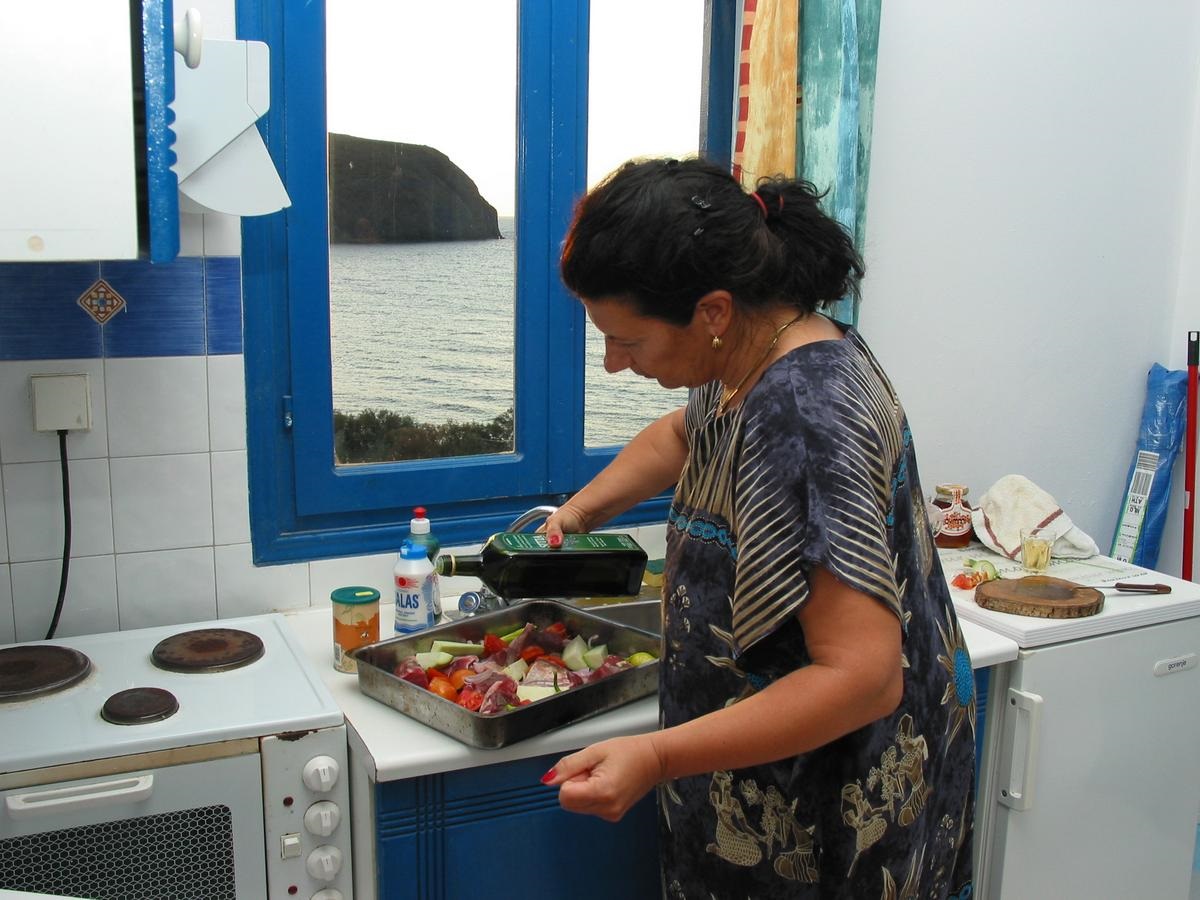 Am nächsten Tag schauten wir uns im Ort nach einem Mietwagen um und wurden auch fündig für 19€. Kochgelegenheit hatten wir im Studio, Andreas versorgte uns mit frischem Gemüse aus eigenem Anbau, den Rest kauften wir auf dem Markt in der Hauptstadt Adamas. Und so zauberte Waltraud jeden Abend in der Küche mit traumhafter Aussicht ein besseres Essen, als wir in irgendeiner Taverne bekommen konnten.