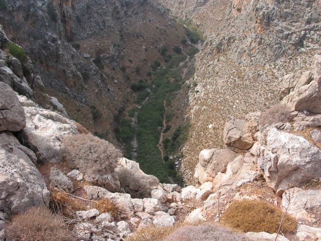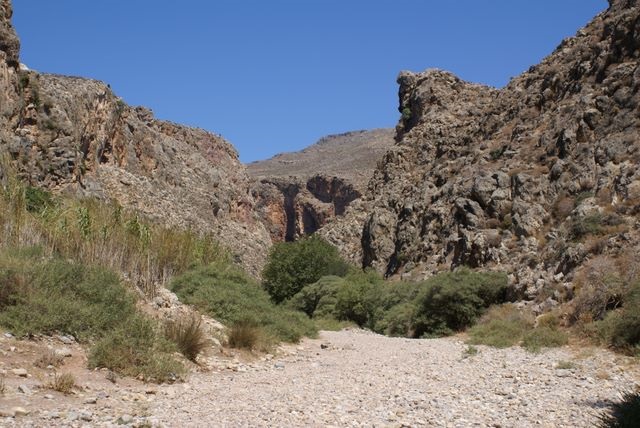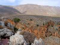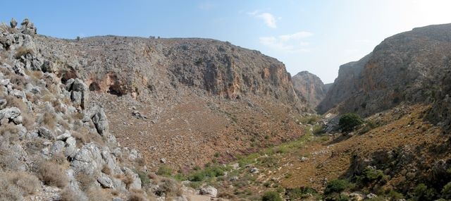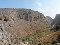 Ausflugsziele gibt es in dieser Gegend auch einige. Eine schöne Wanderung (besonders im Frühjahr) ist die Tour durch das "Tal der Toten" nach Kato Zakros. Blühende Oleander durchsäumen das Tal, herrliche Stille umfängt einen, nur ab und zu unterbrochen vom Schrei eines Raubvogels oder dem Gemecker von Ziegen. Wenn man gut zu Fuß ist, kann man oben am Einstieg in das Tal das Auto abstellen, das Tal durchwandern unten in Kato Zakros am Meer etwas essen und dann zurück den Weg oberhalb der Schlucht nehmen. Die Schlucht ist nicht so gigantisch wie die Samariaschlucht (wir kennen sie nur von Fotos), aber dafür ist man hier gewissermaßen "unter sich". Zu minoischer Zeit wurden in den Höhlen der Schluchtwände die Toten Bewohner des Palastes von Kato Zakros bestattet. Die Überreste des Palastes können besichtigt werden.