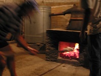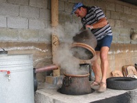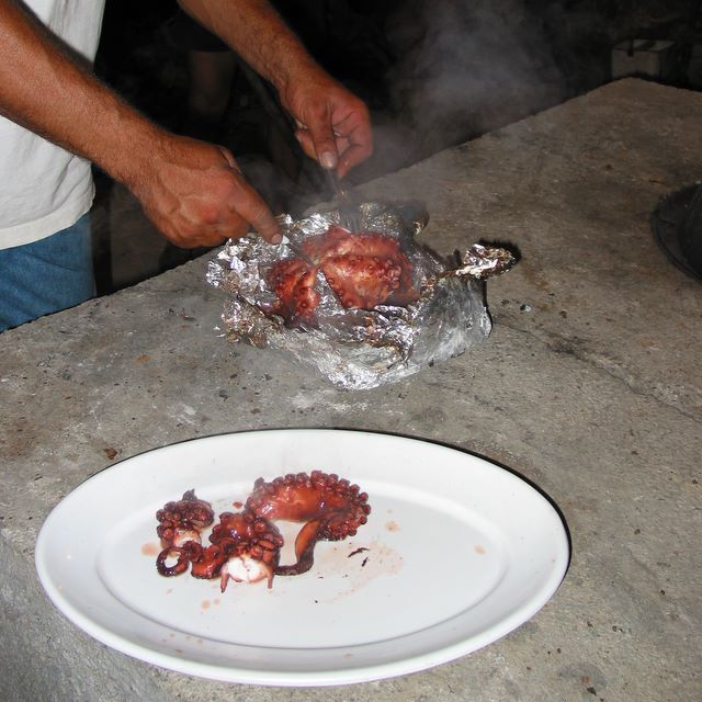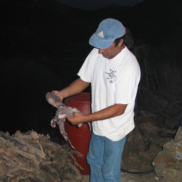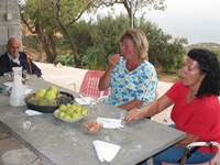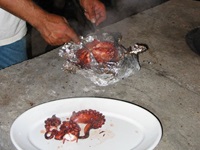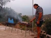 In vielen Serpentinen ging es kurz vor Sitia die Berge hinauf, wo er sein Haus hatte. Zwischen den einzelnen Brennvorgängen gab es reichlich zu Essen. Ein riesiger Oktopus wurde mit Wein in Alufolie eingepackt und dem Brennofen übergeben. Er schmeckte hervorragend. Ebenso mundete dazu der brennwarme Raki. Leider musste sich der Fahrer etwas zurückhalten für den Nachhauseweg. Zu vorgerückter Stunde gab es dann noch eine Tanzeinlage und zum Abschied nahmen wir noch eine Flasche Frischgebranntes mit auf den Weg.