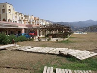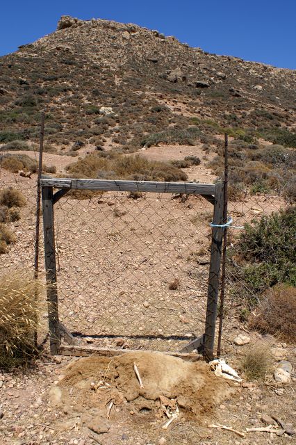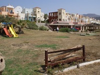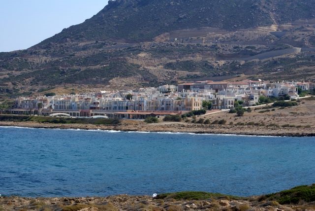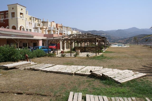Auf dem Weg in den Osten, kurz nach Sitia, kann man eine moderne Geisterstadt bewundern. Dionysos Village, eine riesige Anlage und genaus so große Fehlplanung. Vereinzelt sieht man ein paar Menschen. Dieses Jahr sind wir einmal durch die Anlage hindurch gefahren. Von Nahem erkennt man, dass die unbewohnten Gebäude schon dem Verfall preisgegeben sind. Der Pool ist natürlich leer und es ist auch nichts vorhanden, was man als Strand bezeichnen könnte.