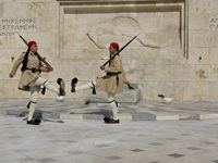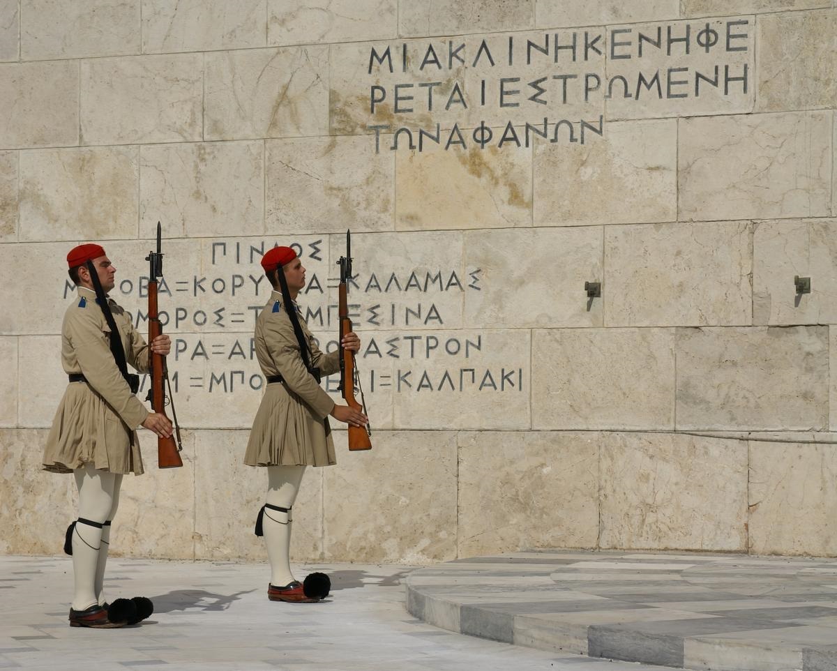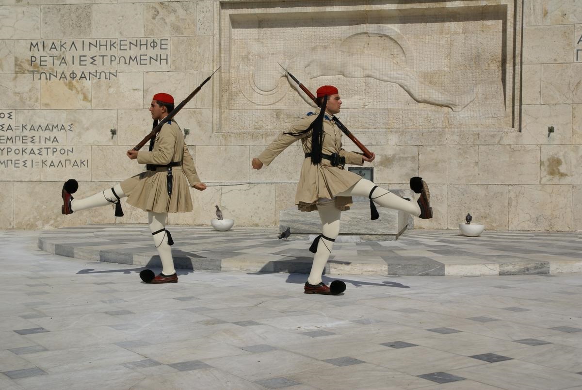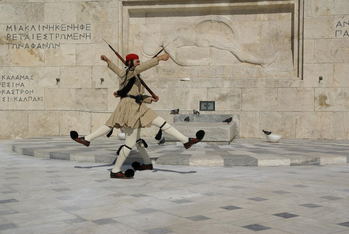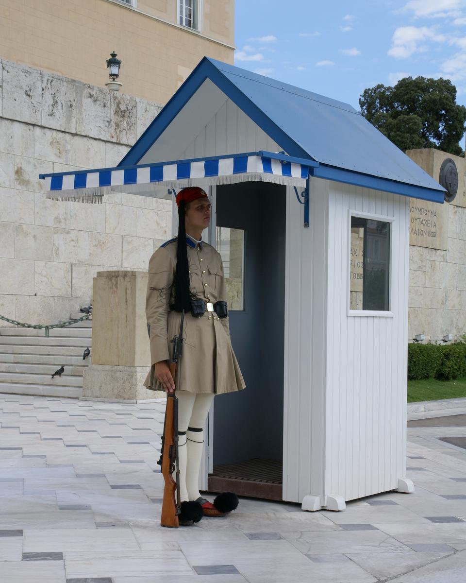 Vor dem Parlament am Grabmal des Unbekannten Soldaten stehen zwei Wachposten der Evzonen, die stündlich mit einer großen Zeremonie abgelöst werden. Was für gewaltige Kerle das sind, merk man erst, wenn man sich neben sie hinstellt. Das ist erlaubt, nur bitte nicht zu nahe, sonst hebt der Wachposten kurz sein Gewehr an und läßt es dann auf das Pflaster knallen. Das ist aber auch die einzige Bewegung, die gestattet ist. Und das eine Stunde in der sommerlichen Hitze. Alle Achtung!