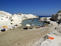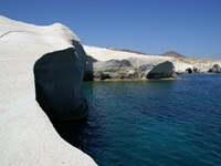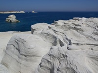 Bei Sarakiniko findet man eine eigentümliche Felsformation vor. Wellenförmig ist das flüssige Gestein aus früheren vulkanischen Aktivitäten erstarrt. Die blendend weiße Bimslandschaft bietet hier einen unglaublichen Kontrast zum blauen Meer und zum Himmel. Baden kann man hier auch, wenn einen die vielen vorbeilaufenden Besucher nicht stören.