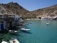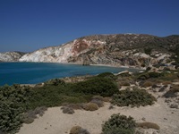 Neues haben wir auf Milos nicht gesehen, aber alles ist so traumhaft schön, dass mann sich nicht sattsehen kann an den Farben der Insel. Das strahlende Blau des Himmels, ganz selten unterbrochen von einer weißen Wolke, die wie zufällig für ein Foto in das Blickfeld schwebte oder das Weiß der Kykladenhäuser an denen sich prachtvolle Bouganvilleas hinauf rankten oder die Strände, allen voran "unser" Firiplaka mit seinen bunten Kieseln und dem Meer, das vom Strand bis zum Horizont alle Möglichkeiten der Blautönung ausschöpft.