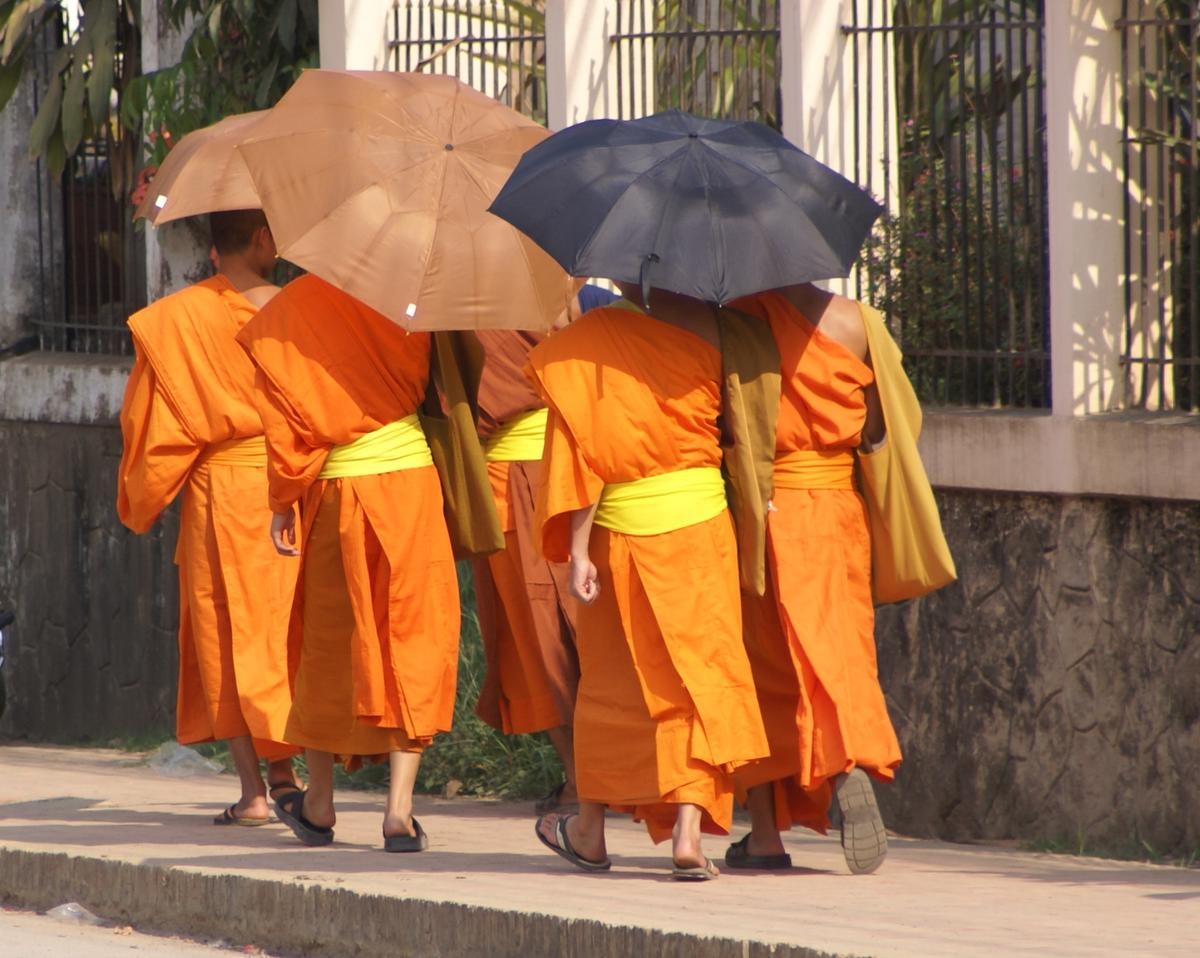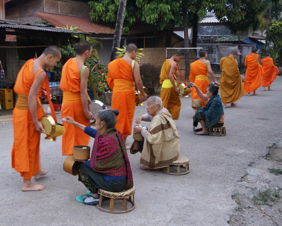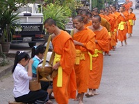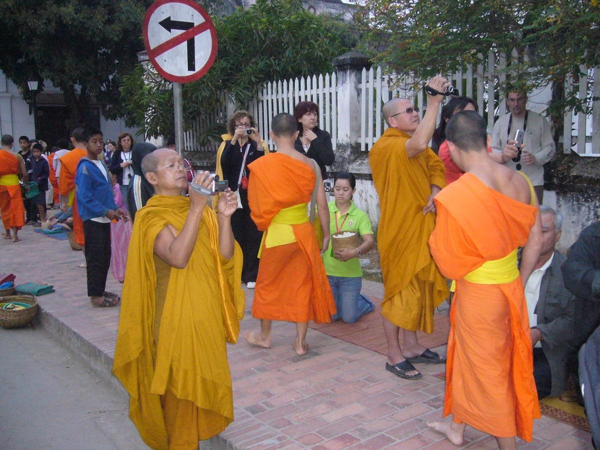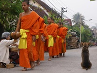 Am nächsten Morgen sind wir rechtzeitig aufgestanden, um die Mönche bei ihrer täglichen Prozession durch den Ort zu beobachten. Sie sammeln sich ihr tägliches Essen ein und jeder Einheimische am Straßenrand hat auch noch für den letzten Mönch etwas Reis. Auch den Touristen werden entsprechende Päckchen verkauft, damit man sie den Mönchen überreichen kann.