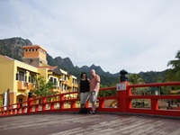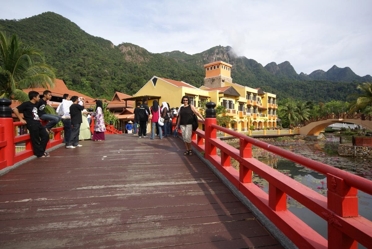 Hinter dem Strandpanorama vom Cenang Beach sieht man eine Bergkette mit dem höchsten Berg von Langkawi. Hier führt auch eine Seilbahn hinauf. Die Talstation ist im "Oriental Village". Eine hübsche Anlage mit Geschäften, Hotels, einem schönen See mit Lotusblumen und der Cable Car-Station. Die Fahrt hierher machten wir mit dem Taxi (ca. 25 min.). Öffentliche Verkehrsmittel gibt es nicht auf der Insel, deshalb haben die Taxis auch Festpreise und sind rel. billig. Der Taxifahrer wartete ca. 1,5 Stunden und nach der Rückfahrt zahlten wir 60 RM (ca. 15 €).