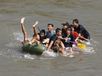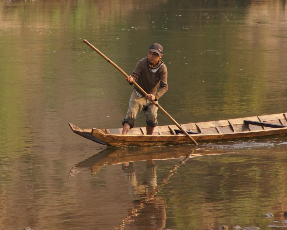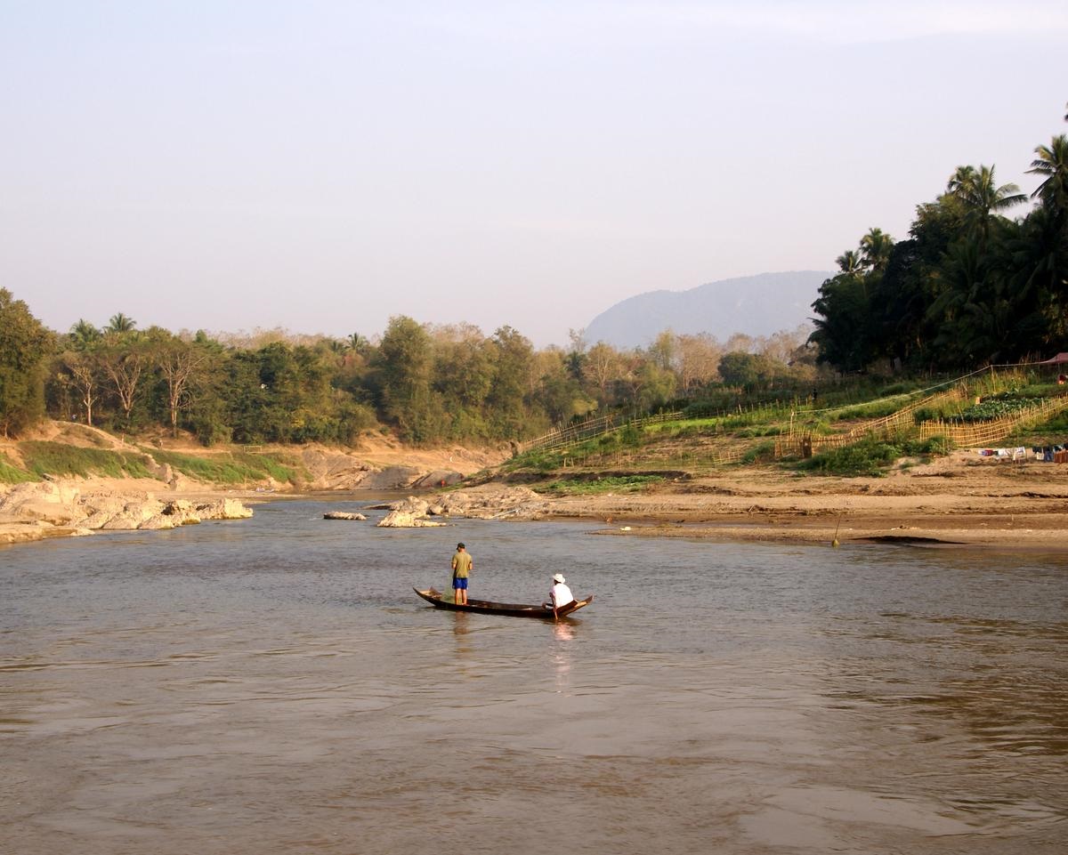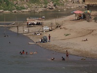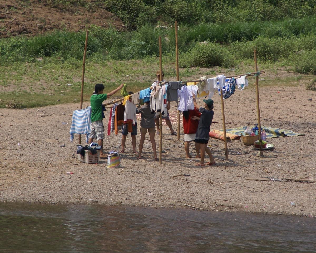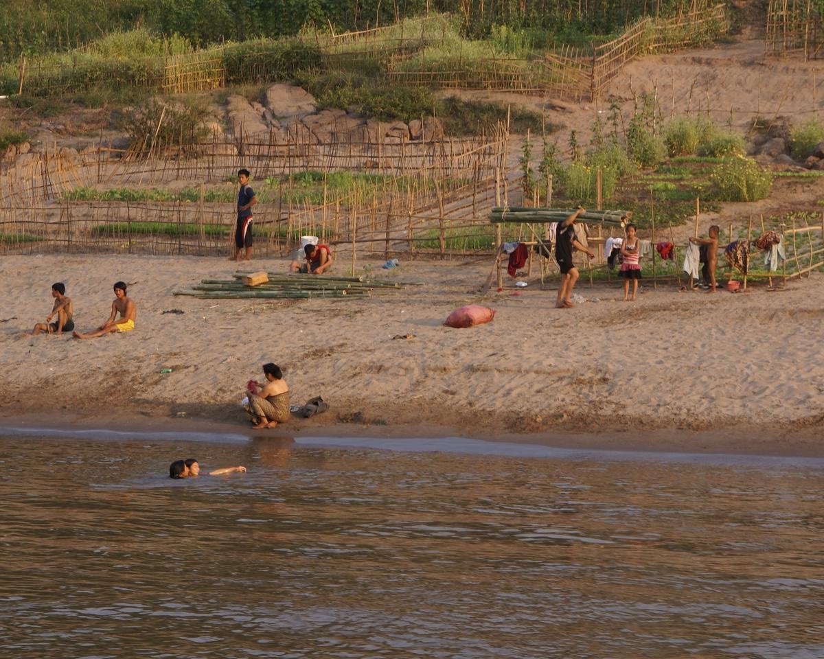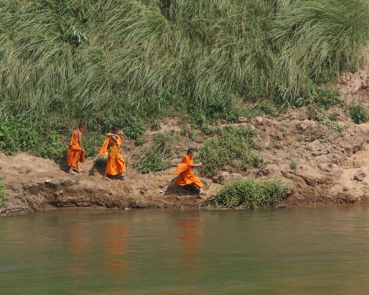 Es ist wunderschön, in Muße das Leben hier an den Flüssen zu beobachten. Am Mekong herrscht mehr das geschäftige Treiben vor mit dem Fährbetrieb, den Ausflugsbooten, Essensangeboten etc., während man sich am kleineren Nam Khan mehr dem Badevergnügen hingibt. Vor allem im Bereich der Bambusbrücke ist immer was los. In großen LKW-Reifen lassen sich die Kinder und Jugendlichen den Fluss hinabtreiben. Auch die jungen Mönche sind dem Badevergnügen nicht abgeneigt. Hier gibt es genügend kleine Restaurants, wo man im Schatten diesem fröhlichen Treiben von oben herab zuschauen kann, vielleicht bei einer Nudelsuppe oder ein paar Frühlingsrollen oder einem Beerlao.