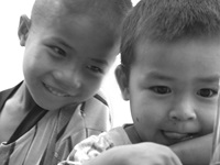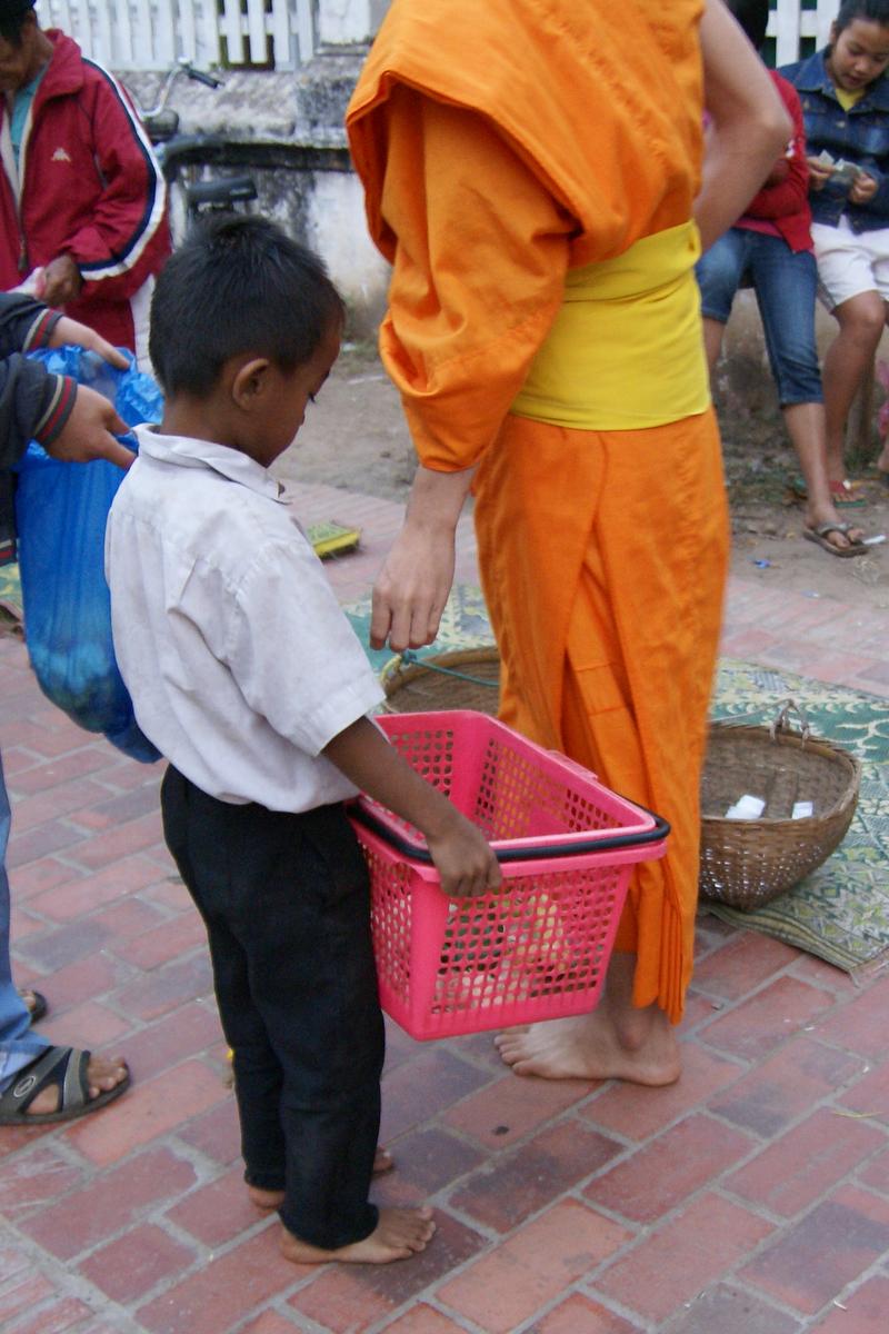 Der Zug der Mönche wurde für uns zum täglichen Ritual. Da der Abend hier relativ früh beendet ist, macht es uns auch nichts aus, jeden Morgen so früh aufzustehen. Heute haben wir auch beobachtet, dass einige älterer Mönche am Strassenrand knieten und den Jüngeren eine Gabe spendeten. Und die jüngeren dann wiederum bettelnden Kindern von ihren gesammelten Gaben reichten. Es ist ein Geben und Nehmen!
