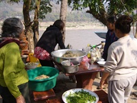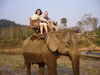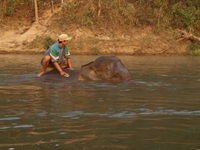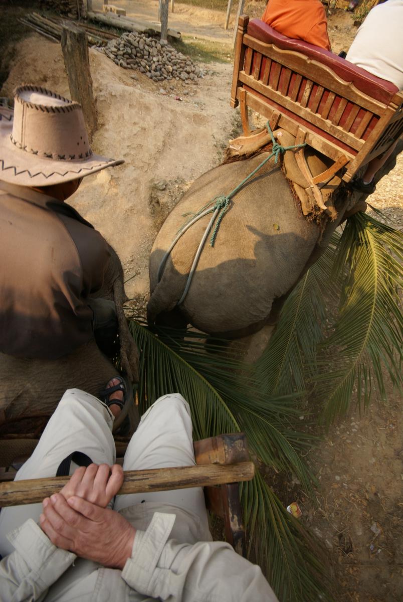 Danach werden zuerst die Tragegestelle aufgelegt und dann gibts Frühstück. Bis zu 250 kg Grünzeug verspeist so ein Dickhäuter täglich. Danach dürfen wir aufsteigen und dann gehts auf die einstündige Tour am Fluss entlang, steil bergab und in den Fluss hinein. Nach dem Ritt gabs noch eine Fütterung mit ein paar Bananen.