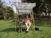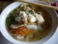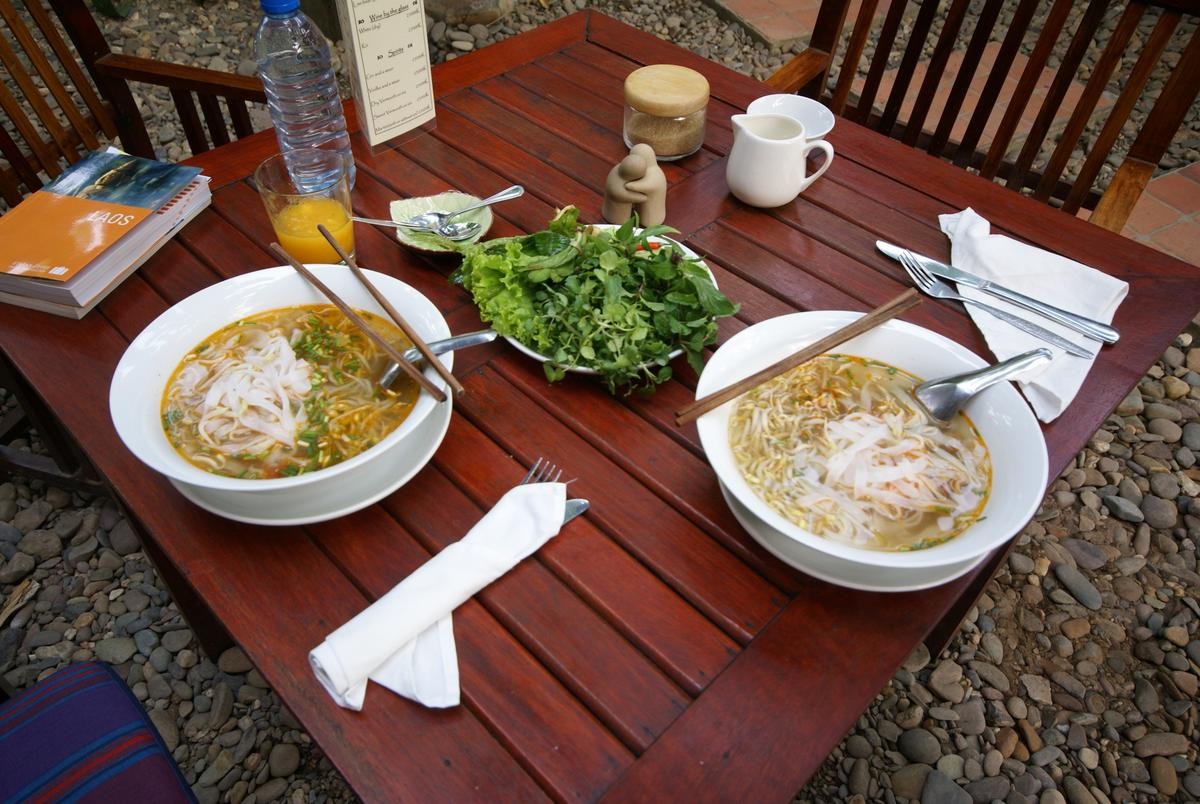 Nach dem Rundgang am frühen Morgen genossen wir das Frühstück im herrlichen Garten unter den riesigen Bananenstauden und planten den weiteren Tag. Es gab zum Frühstück Eier nach Wahl mit getoastetem Baguette, Obst, eigene Marmelade. Wir haben auch die Nudelsuppe probiert. Bei der Bestellung sagte man uns, dass es etwas dauert, weil die Zutaten erst frisch auf dem Mark eingekauft würden. Die Suppe war köstlich! Mit Stäbchen war das auch eine gute Konzentrationsübung für den Morgen.