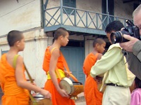 Wenn die Mönche ihre Klöster verlassen, ist es zum Fotografieren noch relativ dunkel. In der Hauptstrasse sind auch viele Touristen. Die besseren Motive findet man in der mittleren Strasse des Ortes, wo auch die Lotus Villa liegt. Sie führt direkt zum Wat Xieng Thong. Hierher kehren die Mönche dieses Klosters nach ihrem Rundgang zurück, die Beleuchtung ist dann schon besser und hier sind fast nur noch Einheimische.
