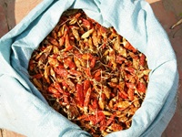 Auf der Rückfahrt von der Pak Ou-Höhle kamen wir noch am Dorf Ban Xang Hai vorbei, welches für seine Whiskybrennereien bekannt ist. Hier gibt es allerlei Trinkbares, Reiswein, Reisschnaps (mit und ohne Einlagen). Wir entschieden uns für ein Fläschchen Reisschnaps (50%, ohne Einlage), der gar nicht mal so übel schmeckte. Hier wird aber nicht nur Trinkbares verkauft, sondern auch schöne Stoffe und Tücher, die im Dorf hergestellt werden. Die Menschen hier bieten ihre Ware an, sind aber nicht aufdringlich. Hoffentlich bleibt das so mit dem zunehmenden Touristenstrom. Gegen Mittag waren wir dann wieder (etwas eingestaubt) in Luang Prabang zurück.