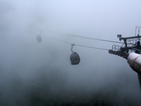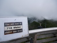 Die Seilbahn hat 2 Stationen. Von der oberen Station führt eine steiler Weg mit Treppe abwärts zu einer eindrucksvollen Brückenkonstruktion, über die man eine weitere Aussichtsplattform ereicht. Von hier oben hat man je nach Witterung eine herrliche Aussicht über die Insel. Die aufsteigenden Wolken erzeugten eine zauberhafte Stimmung, obwohl eine ganz klare Sicht sicher auch nicht zu verachten gewesen wäre.