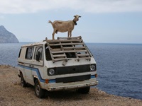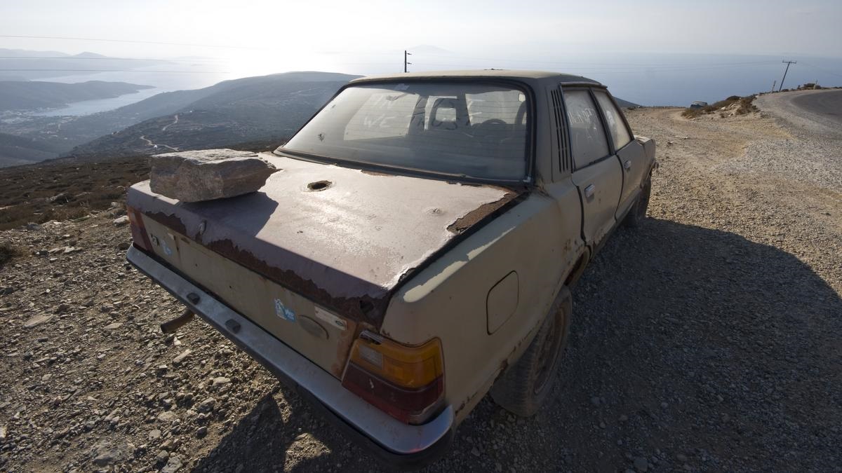 Viele Griechen sind Autoliebhaber. Sie haben ihr Auto so lieb, dass sie ihm auch noch nach Ablauf der aktiven Dienstzeit eine letzte Ruhestätte mit besonderer Aussicht gönnen. So sahen wir an einigen exponierten Stellen alte Autowracks herumstehen und vor sich hin rosten.