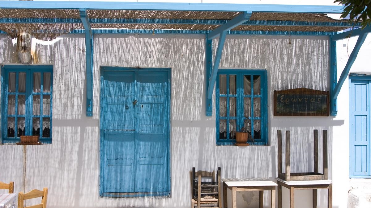 Als Zeus bei seiner tausendjährlichen Steuererklärung darüber sinnierte, ob er wohl seine Gattin Hera als "Außergewöhnliche Belastung" steuerlich geltend machen könnte, stand sie schon, seine Gedanken lesend, erzürnt neben ihm und wollte sein Tintenfass über ihm ausleeren. Zeus wich jedoch blitzschnell aus und so ergoss sich die Tinte statt über das göttliche Haupt über Amorgos und die umliegenden Inseln. Das meiste floss ins Meer, einige Spritzer jedoch benetzten die Türen und Fensterläden der Häuser und die Kuppeln der Kirchen. Seitdem erstrahlen die Kykladen in göttlichem Blau.