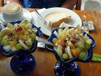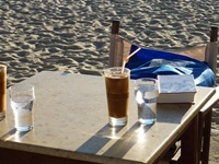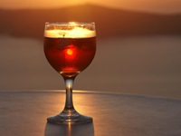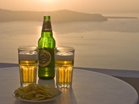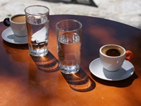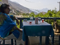 Eine Sehenswürdigkeit von Amorgos ist das Kloster Panagia Chosowiotissa, das 300 m über dem Meer wie ein Schwalbennest an der steilen Bergwand hängt. Nach dem schweißtreibenden Aufstieg wurde uns nach der Besichtigung ein "Raki Psimeni" serviert, ein gewürzter Trester mit Spekulatiusgeschmack. Dazu gab es auch noch Loukoumi und ein Glas Wasser.