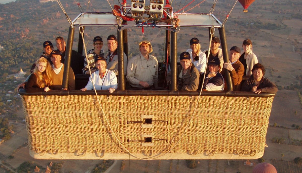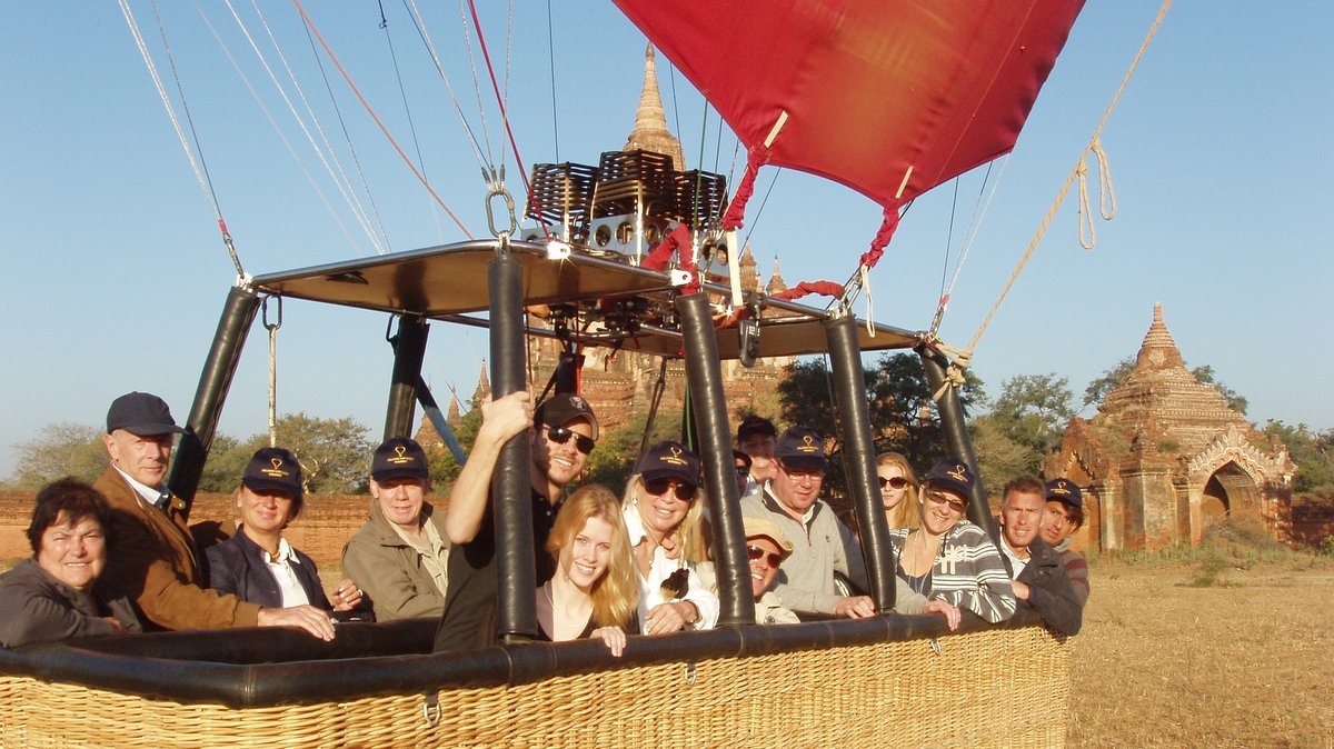 Am nächsten Morgen wurden wir um 5:50 im Hotel abgeholt und zum Startplatz gefahren. Dort gab es Tee und Kaffee und ein paar Instruktionen. Drei Ballons wurden startklar gemacht und um 6:30 ging es in die Luft. Die Sonne war gerade aufgegangen uned es bot sich eine atemberaubende Aussicht auf die über 2000 kleinen und großen Tempel und Pagoden von Bagan. Ein grandioser Anblick! Das Wetter war an diesem Tag nach Aussage des Piloten auch außergewöhnlich klar.