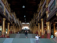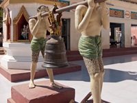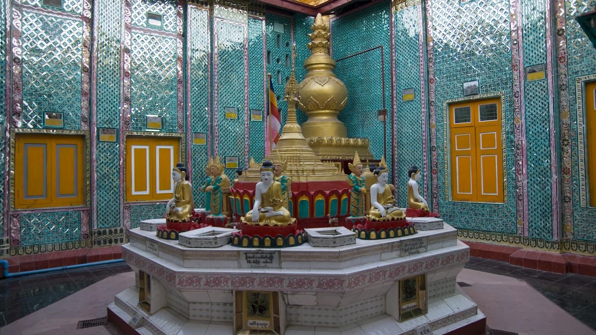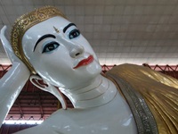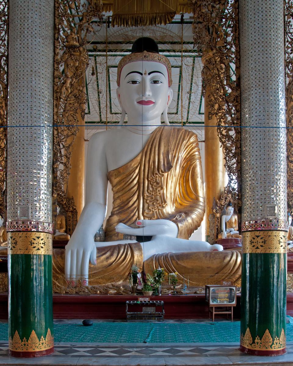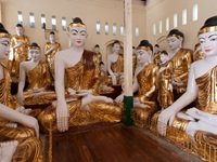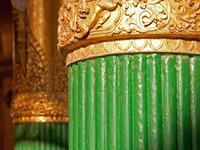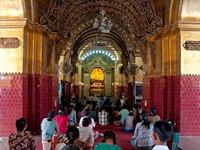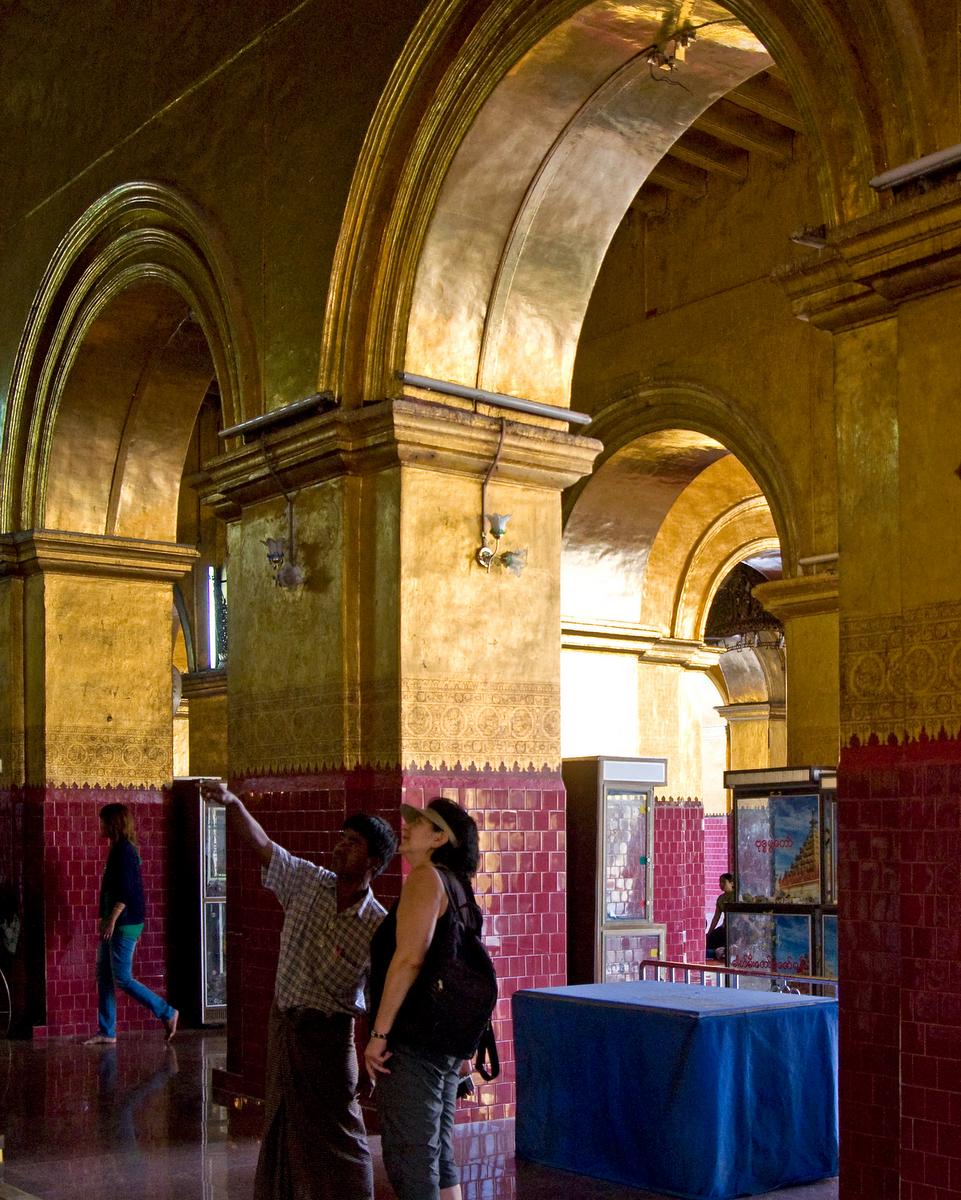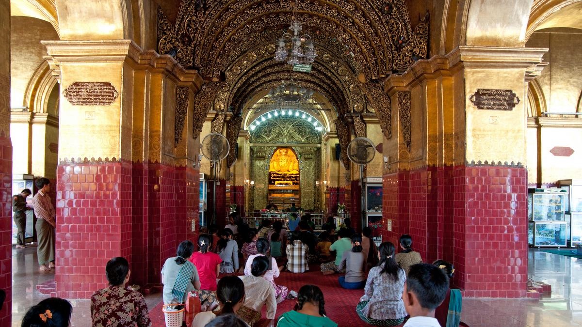 Die Mahamuni Pagode beherbergt eine der wichtigsten Buddhafiguren des Landes. Etwa 3m hoch ist die Figur und im unteren Bereich schon ziemlich unförmig von den Massen an Blattgold, welches im Verlauf vieler Generationen aufgetragen wurde. Bis zu 15cm soll die Schicht stellenweise dick sein. Der Nahbereich der Buddhafigur darf nur von Männern betreten werden.