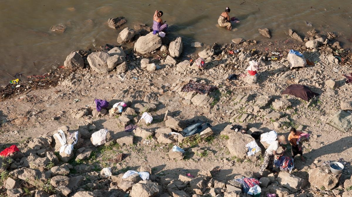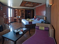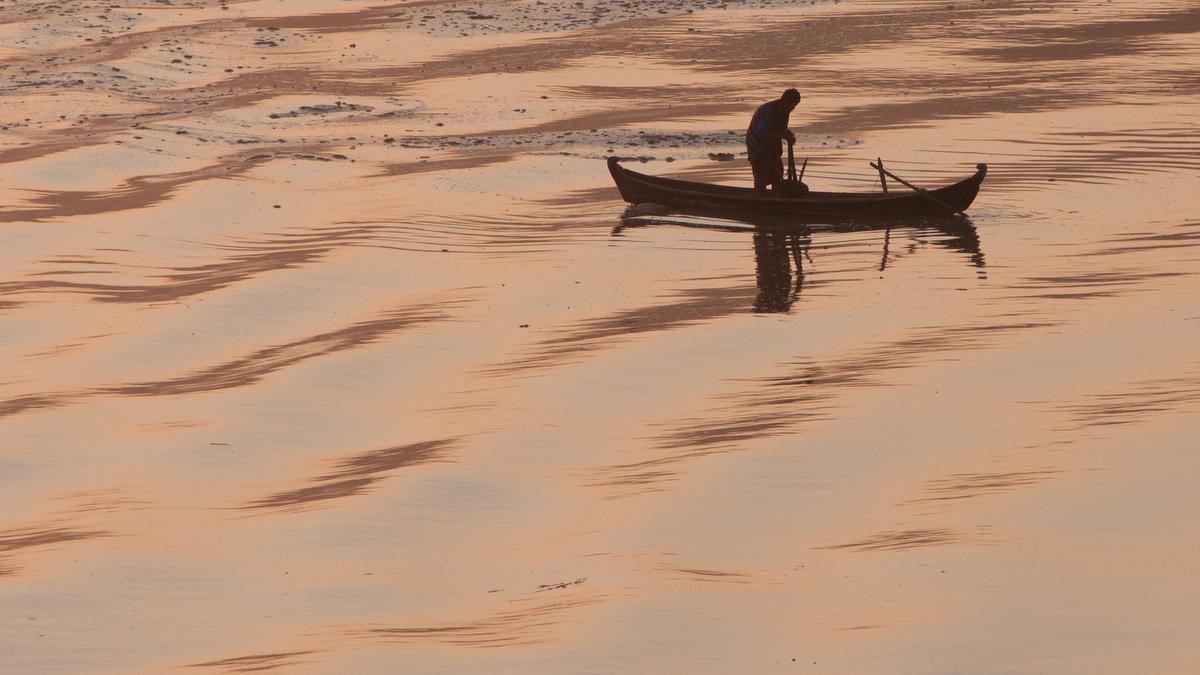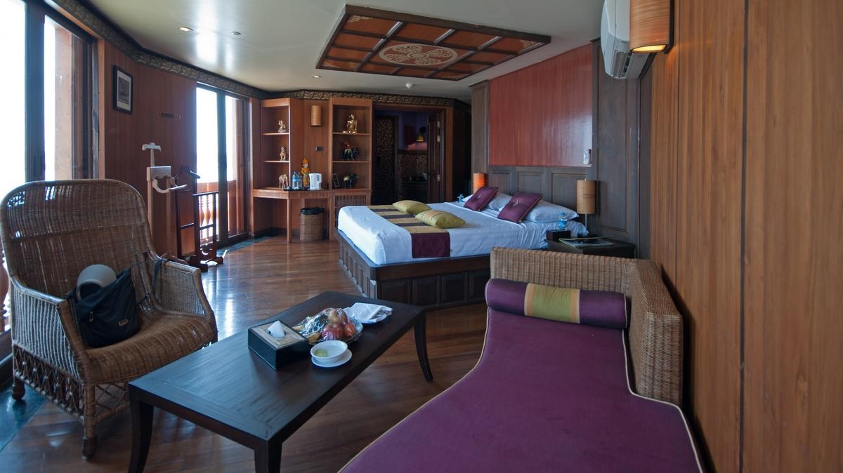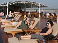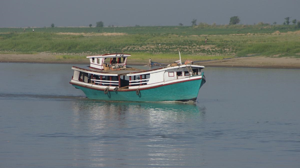 Auf der Paukan erwartete uns eine wundervolle, großzügig ausgestattete Suite, direkt in Fahrtrichtung. Wenn man das Fenster öffnete, blies der Fahrtwind direkt in den Raum. Nach dem Ablegen ging es in Richtung Süden. Das Boot schlängelte sich gemütlich den Irrawaddy hinab. Wegen der Trockenzeit ging es in weiten Schleifen mal am rechten, mal am linken Ufer entlang. Vorbei an Feldern und kleinen Dörfern mit Bambushütten, hinter denen oft der goldene Chedi eines Tempels hervorlugte. Welch ein Kontrast!