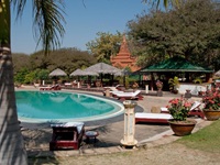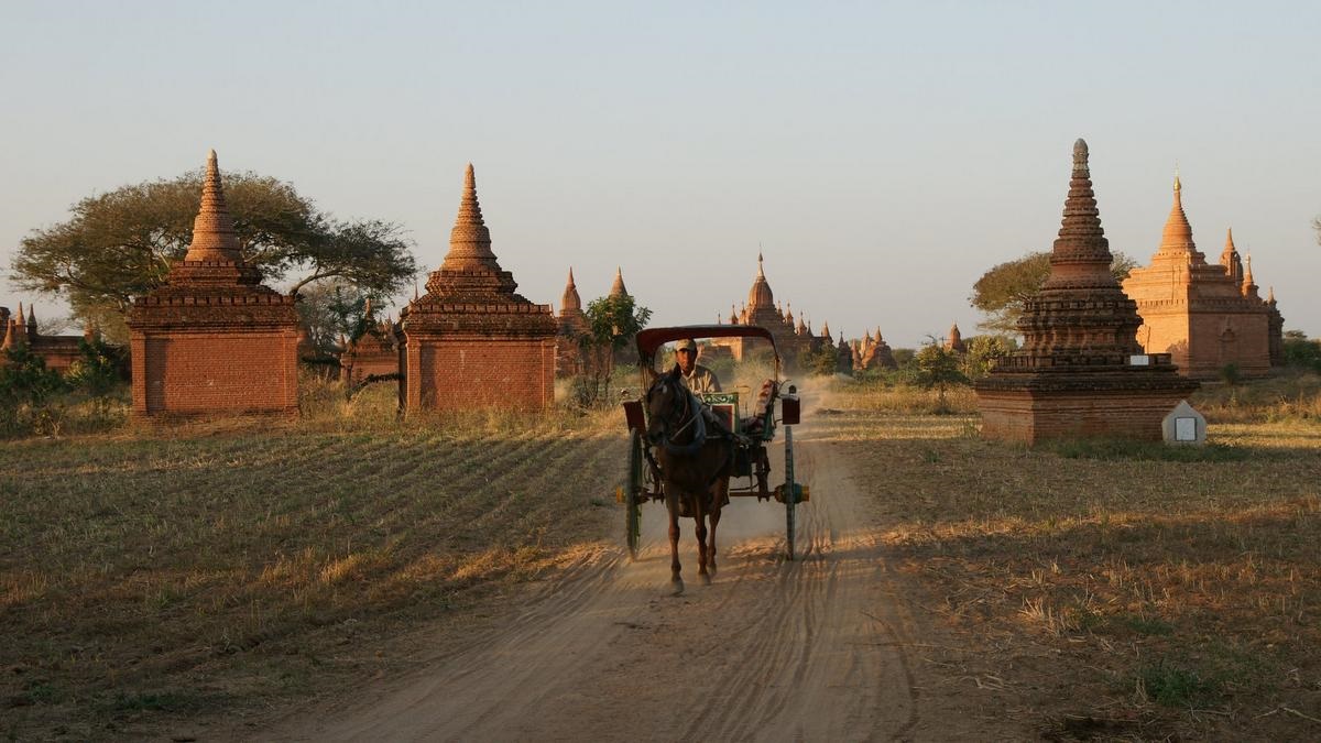 Pünktlich landeten wir und es erwartete uns ein Spalier von freundlich lachenden Händlern und Kindern, die ihre Sachen zum Verkauf anboten. Sie lachten auch noch, wenn nichts gekauft wurde. Mit einer Pferdekutsche ging es dann in das Bagan Tande Hotel bei Old Bagan.