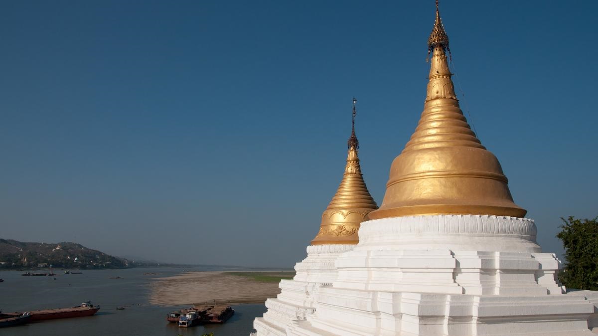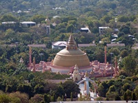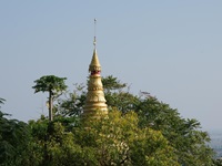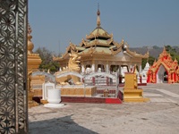 Von Ava fuhren wir über die große Brücke nach Sagaing, ein Hügel mit unzähligen Pagoden. Auch hier war ein Aufstieg per Treppe (ca. 30 min.) notwendig, um den Ausblick von ganz oben zu genießen. Gold, Gold, Gold! Wohin man auch schaute, glänzten kleine und große Pagoden in der Sonne. Ein überwältigender Anblick!