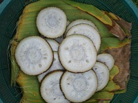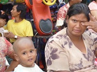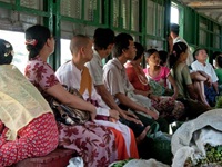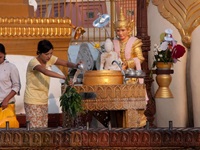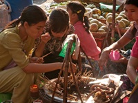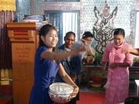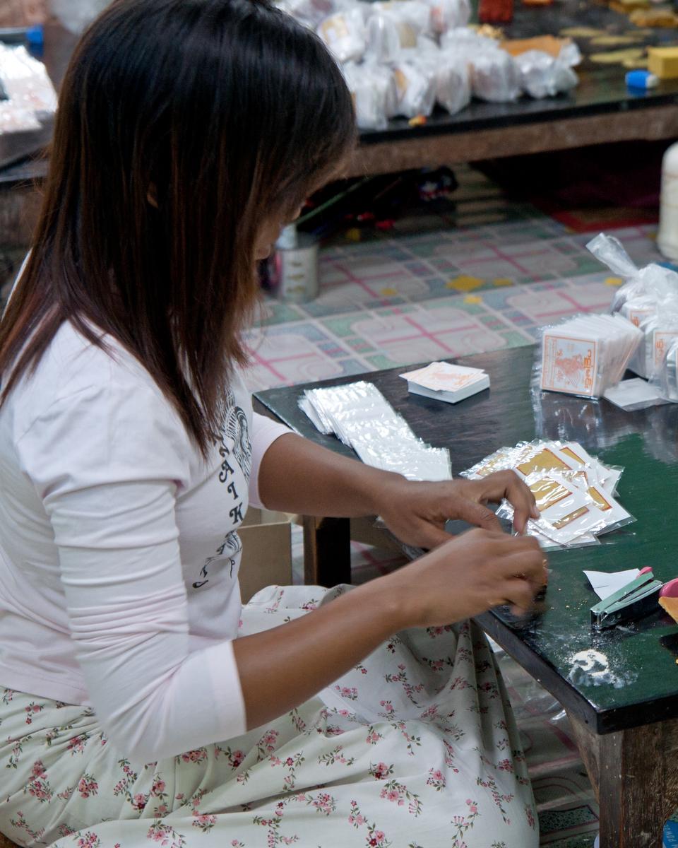 Die Besichtigung einer Blattgoldfabrikation war sehr interessant. In Päckchen zu mehreren hundert Blatt wird das Gold zwischen speziellem Bambuspapier zu Paketen geschnürt. Das Rohmaterial für das Papier wird drei Jahre gewässert. Zum Schluss entsteht ein sehr glattes Papier, an dem die Goldplättchen sich beim Klopfen ungehindert in die Breite treiben lassen. Mehrfachfach werden die Goldplättchen geteilt und wieder zwischen dem Papier eingepackt für den nächsten Arbeitsgang. Mehrere Vorgänge sind dazu notwendig und mehrere Stunden mühsame Arbeit mit dem schweren Hammer. Die Zeit zeigt eine Kokusnussschale an, die in einer Wasserschale schwimmt. In einer halben Stunde ist sie voll gelaufen. Am Ende dieser aufwändigen, mehrstufigen Prozedur sind dann hauchdünne Plättchen entstanden, die man natürlich käuflich erwerben kann. Zum Schluss wurden wir auch noch vergoldet. Wir baten dann unseren Fahrer um vorsichtige Fahrweise, damit die kostbare Fracht nicht beschädigt wird.