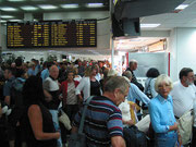 Das Foto ist von 2004, hat aber immer noch Gültigkeit. Der ganze Flughafen ist voll von schlagestehenden Menschen, von denen viele gar nicht wissen, ob sie überhaupt in der richtigen Schlange stehen. Die zwei Stunden, die man vorher dasein sollte, werden vollständig benötigt, um zu suchen, sich durch Schlangen hindurch zu quetschen und mehrfach an riesen Schlangen anzustehen.
