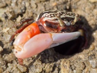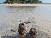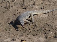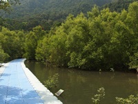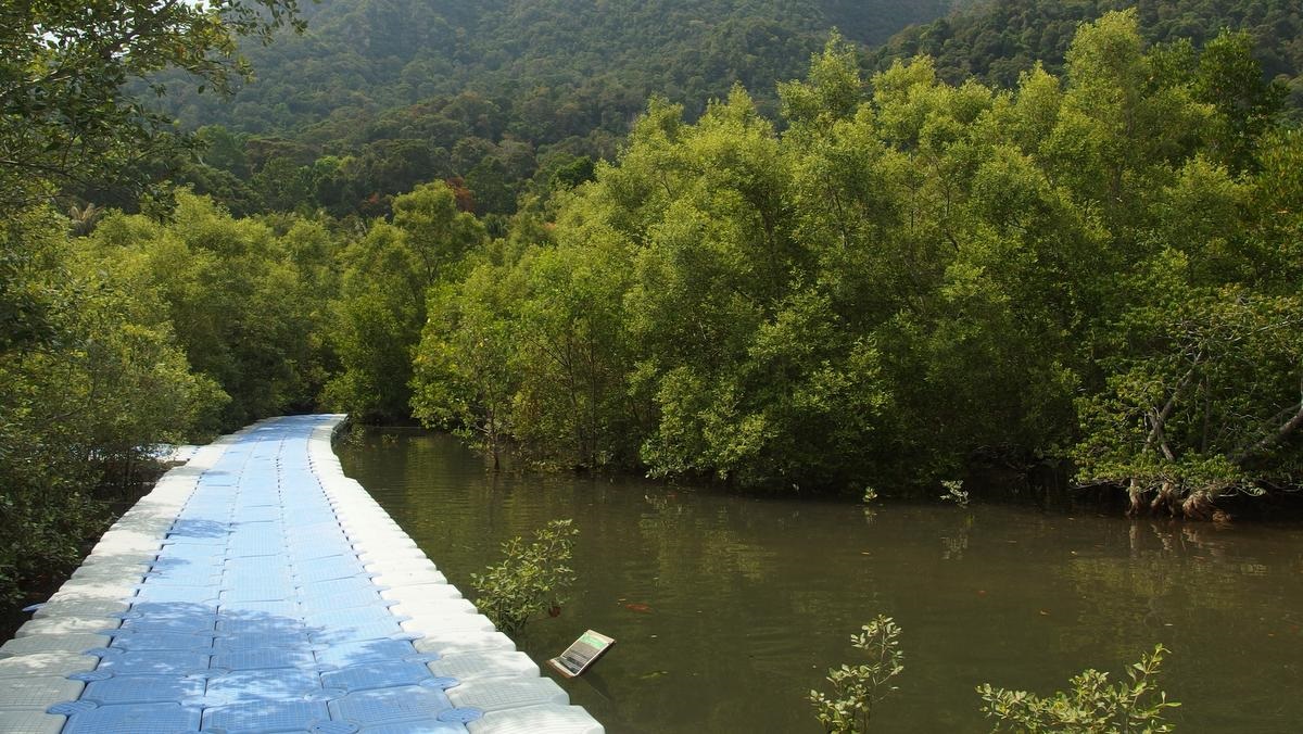 Hinter dem Strand geht ein kurzer Ponton-Pfad in die Mangroven. Wenn man hier bei Ebbe eine Weile bewegungslos verharrt, kann man einige Tiere beobachten. Die Winkerkrabben tauchen aus ihren Löchern auf, Schlammspringer hüpfen übers Wasser wie flache Steine und klammern sich an den Mangroventrieben fest, wenn das Wasser höher steigt, als wenn sie sich vor dem Ertrinken retten wollen. Auch Libellen und Warane kann man hier entdecken.
