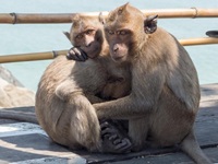 Der Strand vor unserem Resort existiert nur bei Ebbe. Man kann natürlich auch bei Flut baden, dann aber über die Treppe direkt ins Wasser. Wir sind heute, nachdem bei ablaufendem Wasser etwas Strand aufgetaucht ist, nach rechts zum weithin sichtbaren Affentempel gelaufen. Hier ist der Strand etwas breiter und mit ablaufendem Wasser werden immer mehr Liegen und Sonnenschirme aufgestellt (ca. 2,50€). Die Affen haben einen hohen Unterhaltungswert. Interessant ist, dass ein Teil der Affen wasserscheu sind und einen andere Gruppe sich vergnügt ins Wasser stürzt. Vor Allem die Jüngeren sind weniger wasserscheu, sogar längere Tauchgänge kann man beobachten.