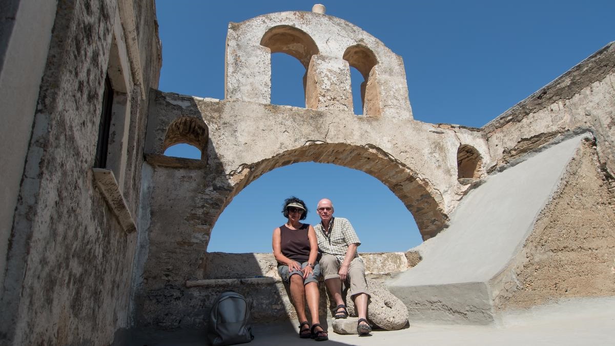 Nach einem 25-minütigen Flug mit einer kleinen Propellermaschine sind wir auf Naxos gelandet und haben unser Auto in Empfang genommen. Unser Studio liegt am Rand von Naxos-Stadt mit einer herrlichen Aussicht. Wir blicken von hier auf die Stadt und die Halbinsel mit der Portara, Reste eines alten Tempels.