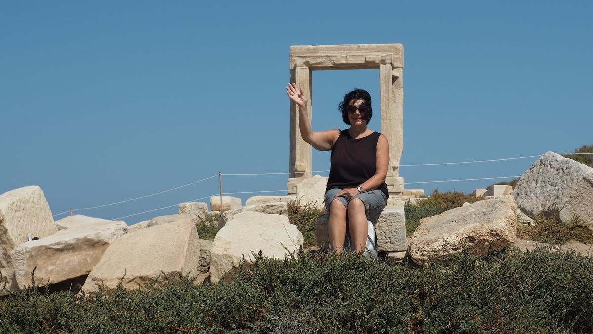 Nach einem 25-minütigen Flug mit einer kleinen Propellermaschine sind wir auf Naxos gelandet und haben unser Auto in Empfang genommen. Unser Studio liegt am Rand von Naxos-Stadt mit einer herrlichen Aussicht. Wir blicken von hier auf die Stadt und die Halbinsel mit der Portara, Reste eines alten Tempels.