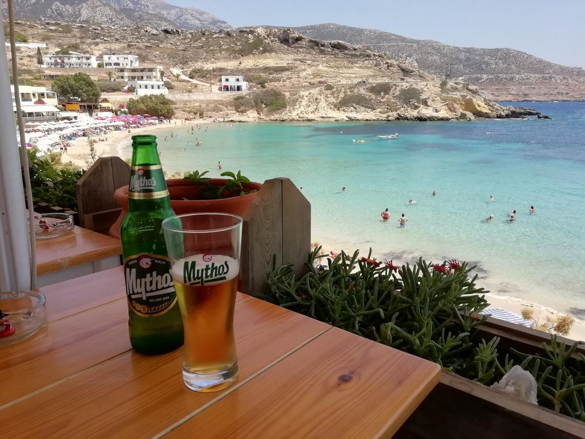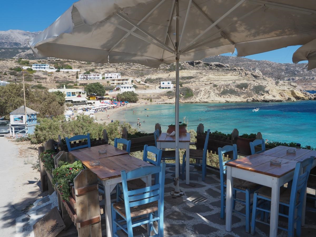 Das Klima war einfach super. Hier weht immer ein kühlender Wind, der einem beim Frühstück schonmal die Wurst vom Brot weht, oder die Milch nicht im Kaffee, sondern auf den Tisch landet. Aber so wurde die sommerliche Hitze sehr erträglich. In Lefkos gibt es 3 Buchten mit unterschiedlichem Wellengang und Wind, so dass man hier flexibel ist. Und was sehr wichtig ist: Es gibt eine reiche Auswahl an Tavernen.