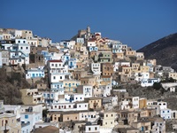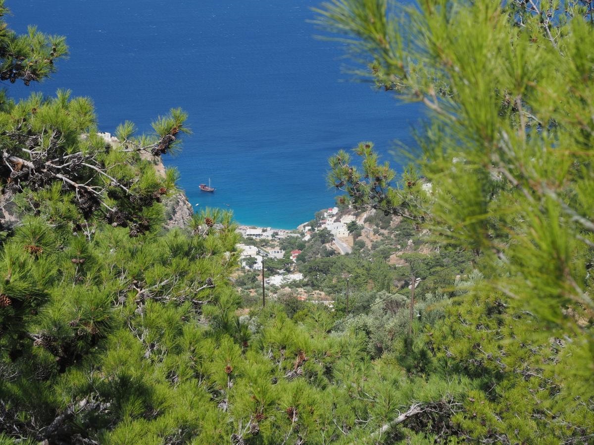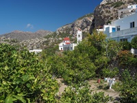 Ca. 30 km geht es von Lefkos nach Norden über eine kurvenreiche Straße. Man genießt die herrlichen Aussichten, sollte aber auch den Blick nicht gänzlich von der Straße nehmen. Viele Steine liegen auf dem Weg, die vom letzte Regen auf die Straße gespült und noch nicht beiseite geräumt wurden. Endlich, nach der letzten Kurve, erschienen die schneeweißen Häuser von Olymbos.